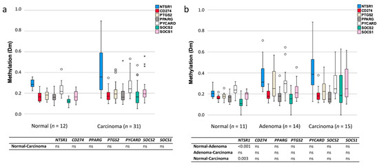 Comparison of the degrees of methylation of inflammation-associated genes in normal colon and tumor specimens. (a) Distribution of methylation dosage (Dm) values in CA-CRC samples. (b) Distribution of methylation dosage values in LS samples. The upper and lower edges of the boxes are the 75th and 25th percentiles, the horizontal line inside the box indicates the median, the whiskers denote the highest and lowest values, and the asterisks and open circles represent outliers: extreme values and potential outliers, respectively (based on the interquartile range (IQR)). Bonferroni-corrected two-sided p values are presented in the tables below for pairwise comparisons, and ns stands for non-significant p value.
