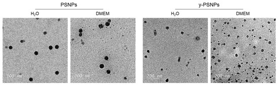 Representative TEM images of PS nanoparticles (PSNPs and y-PSNPs). Samples were prepared using 26 μg/cm2 dilutions, in distilled water and DMEM, of each nanomaterial.