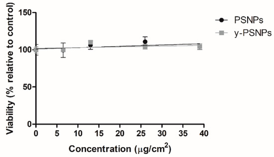 Exposures lasting for 24 h were carried out at a concentration range of 0, 6.5, 13, 26, and 39 μg/cm2. Results indicate that the exposed cells displayed very low levels of cytotoxicity to PSNPs and y-PSNPs, as shown in Figure 2. Even at the highest 39 μg/cm2 concentration tested the cell viability remains very close to 100% after PSNPs and y-PSNPs exposures when compared to the untreated control. According to this, concentrations ranging from 0.006 to 6.5 μg/cm2 were selected for the assessment of PSNPs’ long-term effects. It should be remembered that we aimed to test “human realistic” exposure conditions, assuming exposures lasting for long-time to very low concentrations. Interestingly, the selected range includes a concentration resembling the potential exposure from food ingestion (0.0006 μg/cm2, equivalent to a potential exposure from a portion of mussels). The highest concentration used (6.5 μg/cm2) was the lowest tested to determine acute toxicity.