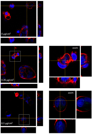 Three-dimensional confocal microscopy images of undifferentiated Caco-2 cells after a 24 h exposure to y-PSNPs. Nuclei are stained in blue, cell membranes in red, and nanoparticles are depicted in green. Dotted lines point out the plane from where the orthogonal views are projected. Images on the left correspond to cells exposed to the different concentrations of y-PSNPs indicated while images on the right correspond to the zoomed area highlighted by a grey square.