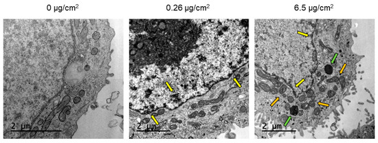 Confocal microscopy was used to analyze the ability of Caco-2 cells to internalize PS nanoplastic particles after short-term exposure. As seen in Figure 3, the particles were largely found inside the cells at all concentrations tested after 24 h of exposure, following an increased cellular accumulation trend at higher concentrations. Besides their location in the cytoplasm, y-PSNPs were also present in the cell nuclei at all concentrations. The uptake of PSNPs was also assessed by TEM. As shown in Figure 4, PSNPs-exposed Caco-2 cells exhibited a considerable number of intracellular particles. The untreated control group displayed normal cell morphology, with a well-organized nucleus and nucleolus, mitochondria with regular cristae, and normal cellular membranes. On the other hand, PSNPs-exposed samples showed structural differences at every concentration tested, which formed dark electron-dense structures in the perinuclear region (indicated with yellow arrows in Figure 4). We also observed, as pointed out with green arrows in Figure 4, an increased accumulation of electron-dense vacuoles and lysosomes at the 6.5 μg/cm2 concentration. The images also showed mitochondrial cristae swelling for the highest concentration (indicated with orange arrows in Figure 4). Taken together, these results evidence that PSNPs uptake causes subcellular responses that increase in a dose-dependent manner. Given these results, we chose to continue the long-term experiments with PSNPs using 6.5, 0.26, 1.3, and 0.0006 μg/cm2.