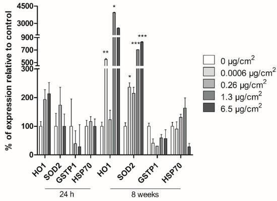 Study of Caco-2 cells’ response after 24 h and 8 weeks of PSNPs exposure using Real-Time RT-PCR. The percentage of expression for each gene is shown compared to untreated controls, per dose and gene. Data are presented as mean ± SEM for each treatment dose and analyzed by the student’s t-test. * p ≤ 0.05, ** p ≤ 0.01, *** p ≤ 0.001.