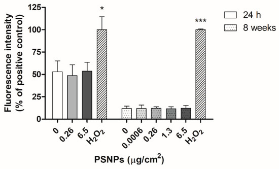Presence of intracellular ROS levels as detected by DCFH-DA fluorescence assay in cells exposed to PSNPs for 24 h and 8 weeks, untreated controls, and positive controls treated with H2O2. The percentage of fluorescence intensity relative to the positive control is shown. Data are represented as mean ± SEM for each exposure concentration and analyzed by one-way ANOVA with Dunnett’s multiple comparison post-test. * p ≤ 0.05, *** p ≤ 0.001.
