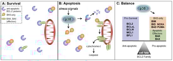 Connections between apoptosis and all three MAPK pathways have been reviewed in [,]. p38 pathway activation is one route upstream of caspase activation to induce apoptosis. Although internal BCL2 family binding dynamics are based on hydrophobic pockets and amphipathic helices, individual BCL2 proteins are also regulated by post-translational modifications, namely phosphorylation, that typically impact BCL2 stability. For example, both BCL2 and MCL1 are phosphorylated by CDK1 resulting in their ubiquitination and degradation []. These post-translational modifications allow kinase pathways like p38 to impact the stability and therefore availability of BCL2 members to perform either their pro- or anti- apoptotic functions.