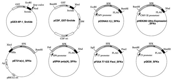 The plasmids shown in Figure 1 were constructed. Plasmid construction experiments were performed using the In-Fusion HD Cloning Kit. Two complementary DNA oligomers encoding Srctide (GEEPLYWSFPAKKK) [] were annealed to form a double-stranded DNA sequence that was inserted between EcoRI and XhoI of pGEX-6p-1 to construct pGEX-6P-1_Srctide. In pGEX-6P-1_Srctide, the sequence of XhoI was replaced with tcgag (see the primer sequence of pGEX-6P-1_ΔXhoI in Table S1). Therefore, the resulting construct was confirmed by digestion with EcoRI and by the lack of digestion with XhoI. The sequence of the GST-tagged Srctide was amplified from pGEX-6P-1_Srctide and inserted between BamHI and XhoI of pCDF-1b to construct pCDF_GST-Srctide. The UniProt Accession No. of each SFK and expression vectors for subcloning are summarized in Table 1. All DNA oligomers used for the plasmid construction are shown in Table S1. For the construction of pCDNA3.1(−)_SFKs, each SFK sequence (Src, Fgr, Hck, Yes, Blk, Fyn, Lck, or Lyn) was designed and amplified to include a FLAG tag at the C-terminal end and inserted between EcoRI and BamHI of pcDNA3.1(−). For the construction of pHEK293 Ultra Expression Vector_SFKs, each SFK sequence was designed and amplified to include a FLAG tag at the C-terminal end and inserted between BamHI and XbaI of pHEK293 Ultra Expression Vector I. For the construction of pET21a(+)_SFKs, each amplified SFK sequence was inserted between BamHI and XhoI of pET21a(+). For the construction of pSP64 poly(A)_ SFKs, each SFK sequence was designed and amplified to include a FLAG tag at the C-terminal end and inserted between PstI and XbaI of pSP64 poly(A) vector. For the construction of pFN25A T7 ICE Flexi_SFKs, each SFK sequence was designed and amplified to include a FLAG tag at the C-terminal end and inserted between SgfI and PmeI of pFN25A T7 ICE Flexi Vector. For the construction of pQE30_SFKs, each SFK sequence was designed and amplified to include a FLAG tag at the C-terminal end and inserted between BamHI and HindIII of pQE30. Mutagenesis of SFKs was performed using the primers listed in Table S1. All sequences into which mutations were introduced were confirmed using an ABI PRISM 3130XL Genetic Analyzer (Applied Biosystems, Foster City, CA, USA).