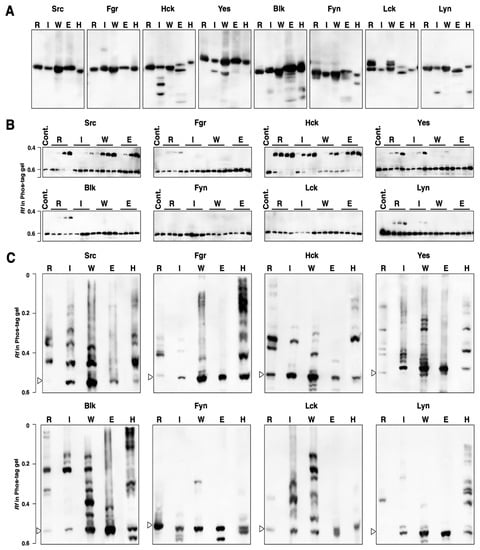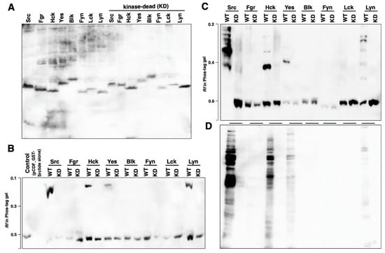 Kinase-dead mutants were expressed in the cell-free systems and the effects of the mutation on the kinase activities and phosphorylation status of SFKs were investigated. First, we confirmed that all mutants were inactive in phosphorylation assays using GST-Srctide (Figure S3). Next, the Phos-tag banding patterns were compared between the wild type and the corresponding kinase-dead mutants (Figure 5). In the rabbit reticulocyte system, Src, Fgr, Hck, Yes, Blk, and Lyn showed significantly different patterns between the wild type and the kinase-dead mutant; some of the phosphorylation bands observed in the wild type disappeared in the kinase-dead mutant. In contrast, the banding patterns of each kinase-dead mutant from the other three systems were almost the same as those of the corresponding wild types. According to the phosphoproteomics database PhosphoSitePlus (https://www.phosphosite.org/homeAction.action, accessed on 1 October 2021), multiple phosphorylation sites for each SFK have been reported: 32 for Src, 15 for Fgr, 19 for HCK, 30 for Yes, 14 for Blk, 36 for Lck, 22 for Fyn, and 38 for Lyn. Both wild types and kinase-dead mutants would be phosphorylated at multiple sites other than the autophosphorylation site and they showed complicated band patterns. The multiple upshifted bands observed in each kinase produced by the four cell-free systems return to their unphosphorylated position by alkaline phosphatase treatment (see Figure S6), so upshifted bands were due to phosphorylation and not other modifications. As shown in Figure 2A, Src, Fgr, Hck, Yes, Blk, and Lyn expressed in 293 cells also showed different banding patterns between the wild type and the kinase-dead mutant. This indicates that the rabbit reticulocyte system would have similarities to human cells in terms of the mechanism of post-translational phosphorylation.