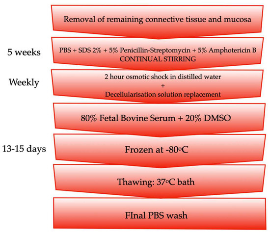 The decellularisation technique has been fully described elsewhere [18]. Briefly, the tracheas were sectioned into specimens measuring 2 cm in length. All remaining connective tissue and mucosa were removed [19]. The specimens were then submerged in a PBS solution containing 2% sodium dodecyl sulfate (SDS; Sigma-Aldrich, San Luis, MO, USA), penicillin-streptomycin 5% and amphotericin B 5% (both obtained from GibcoTM Thermo Fisher Scientific; Waltham, MA, USA) for 5 weeks under continual stirring. The decellularisation solution was replaced weekly after a 2-h osmotic shock in distilled water. The specimens were then frozen in a mixture of 80% fetal bovine serum (GE Healthcare Hyclone; Madrid, Spain) and 20% dimethyl sulfoxide (DMSO; Sigma-Aldrich; San Luis, MO, USA) at −80 °C until use. Defrosting was carried out in a 37 °C bath followed by a final wash with PBS (Figure 1). Decellularisation was evaluated by DAPI staining. DNA concentration was estimated through spectrophotometry (measuring absorbance at 260/280), using the Nanodrop spectrophotometer (Isogen Life Science. Utrech, Netherlands). The size of the extracted DNA was evaluated through chromatography using the Agilent bioanalyzer (Agilent, Santa Clara, CA, USA).
