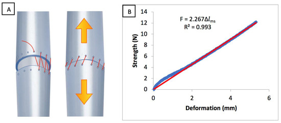 (A) Assembly of the two anastomosed jaws by the same technique used for the tracheas. (B) Force–deformation curve of the jaw-suture set (blue line). The trend line (in red) has a slope of 2.267 N·mm−1 (F: Force, ∆lms: suture and jaws deformation, R2: correlation coefficient).