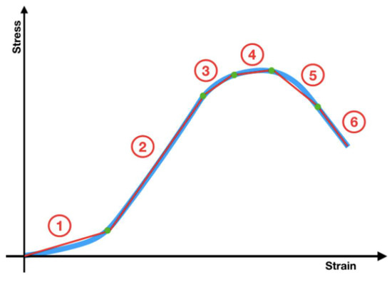 Stress–strain curve defining the segmented linear regression lines into which the curve can be broken down. Number 2 shows the slope of the last segment before it reached the proportional limit compared to the previous one.
