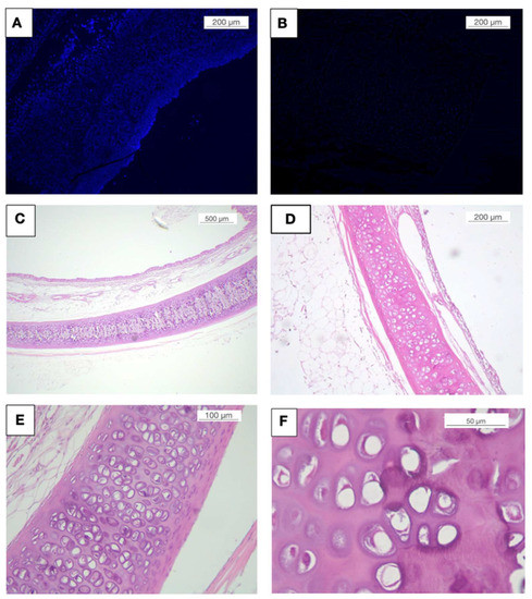 The tracheae were decellularised as described above. Cellular removal was evaluated by DAPI staining (Figure 6A,B). H-E staining showed a decellularised organ with minimal chondrocyte debris in cartilage (Figure 6C–F). DNA quantification did not detect values >50 ng or 200 pb in electrophoresis.