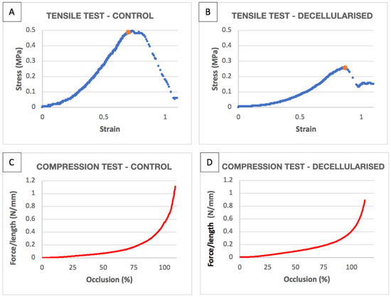 (A) Stress–strain graphs of tensile tests on a control trachea. (B) Stress–strain graphs of tensile tests on decellularised trachea. The orange dot marks the maximum or break point. (C) f curve by percentage occlusion of compression tests on a control trachea. (D) f curve by percentage occlusion of compression tests on a decellularised trachea.