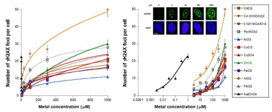 Interestingly, the majority of studies about MI biological effects have focused on base damage (BD) and/or DNA single-strand breaks (SSB) while there is still no clear quantified link between these types of DNA damage and cell death (toxicity) or cell transformation (cancer) [1,2,11,12]. By contrast, studies about the biological effects of ionizing radiation, another toxic and carcinogenic agent, provide increasing evidence of a causal and quantified link between toxicity and unrepaired DNA double-strand breaks (DSB) on one hand, and genomic instability and misrepaired DSB on another hand [13,14]. However, unlike radiation-induced (RI) stress, MI stress was long considered to be too energetically low to produce DSB. However, Fenton-like reactions and genetic impairments in the DSB repair pathways may cause indirect production of DSB in response to metal exposure. This hypothesis has been documented both in vivo and in vitro by using different DSB assays [1,2,15,16,17,18,19,20,21,22].