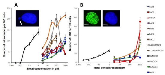 In the same experimental conditions, we investigated other endpoints generally associated with unrepaired DSB such as the yields of micronuclei and highly damaged cells (HDC) (defined here as nuclei showing more than 15 γH2AX foci per cell) [34,38]. Micronuclei are considered to be the cytogenetic reflection of the unrepaired DSB propagated to the mitotic phase [40]. The number of MI micronuclei generally obeyed a pseudo-sigmoidal function of the metal concentration in agreement with the γH2AX data (Figure 2B). Moreover, the MI micronuclei curves of CrO42− again appeared shifted to the nM range. Interestingly, some metal species such as Pb2+ and Cu2+ showed a drastic decrease in the number of micronuclei at high metal concentrations. At this stage, we can evoke the possibility that the process of micronuclei was so rapid that a large number of them escape from cells (exocytosis phenomenon) during the immunofluorescence procedure, as previously reported [11].
