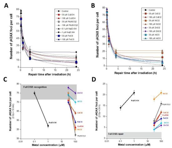 RI DSB repair kinetics after metal exposure. (A,B) The number of γH2AX foci as a function of repair time post-irradiation in the human untransformed radioresistant 149BR incubated for 24 h with the indicated concentration of metal species. Each plot represents the mean ± standard error (SEM) of at least three replicates. (C) The γH2AX data shown in panels (A,B) and obtained after 10 min post-irradiation were plotted against the metal concentration. The grey zone corresponds to the numerical values when all the RI DSB are recognized. A decrease in the number of γH2AX foci is interpreted as a defect in the DSB recognition. (D) The γH2AX data shown in panels A and B and obtained after 24 h post-irradiation were plotted against the metal concentration. The grey zone corresponds to the numerical values when all the RI DSB are unrepaired. An increase in the number of γH2AX foci is interpreted as a defect in the DSB repair.