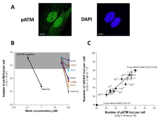 The data described above suggest that the presence of metal inhibits DSB recognition and/or repair via the ATM-dependent NHEJ pathway. Therefore, we examined the nuclear relocalization of the auto-phosphorylated form of the ATM protein, reflecting its kinase activity in the nucleus [31]. By applying anti-pATM immunofluorescence to cells exposed to metal and IR, the number of the nuclear pATM foci assessed 10 min after irradiation were found to be generally lower than those obtained with non-exposed cells, in good agreement with the γH2AX data (Figure 4A,B). Interestingly, when metal species were classified by their capacity of inhibiting DSB recognition, the rank order obtained with pATM and γH2AX data were found to be not significantly different (Figure 4C). A quantified correlation was also obtained between the two data groups with a γH2AX/pATM ratio of two, in full agreement with the RIANS model [28,31]. Again, these findings strongly suggest that metal exposure may impair the recognition of DSB by the ATM-dependent NHEJ pathway, which also impacts the quality of the DSB repair. Altogether, our findings can be interpreted as the result of a delay of the nucleo-shuttling of the ATM protein as proposed in a number of published papers [30].