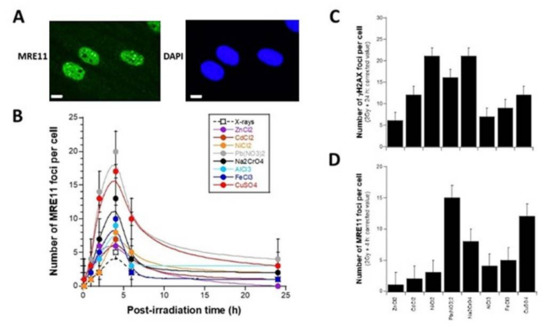 In order to examine the formation of MRE11 foci after a MI stress, fibroblasts were exposed to metal for 24 h and irradiated thereafter at 2 Gy X-rays. Anti-MRE11 immunofluorescence was applied from 10 min to 24 h post-irradiation. While the 149BR cells that were not exposed to metal showed a slight increase in the number of MRE11 foci from 1 to 4 h post-irradiation, the exposures with the metallic species tested resulted in a significant increase in the number of MRE11 foci. The highest numbers of MRE11 foci values were generally reached at 4 h post-irradiation (Figure 5). If the metallic species tested were classified according to these maximal MRE11 foci values (from the highest to the lowest one), it would be as follows: Pb(NO3)2 > CuSO4 > Na2CrO4 > FeCl3 > AlCl3 > NiCl2 > CdCl2 > ZnCl2. Figure 5C,D reflects the differences between the number of residual γH2AX foci and the maximal number of MRE11 foci.