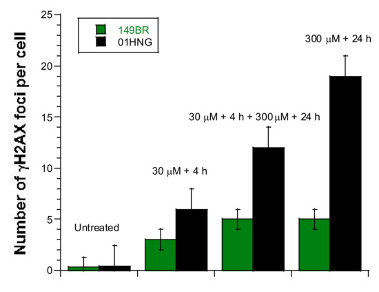 In order to examine whether cells with delayed RIANS show an adaptive response-like phenomenon with metal exposure consisting in a succession of two concentrations c and C separated by a certain period of time Δt (i.e., c + Δt + C), we incubated cells with 30 µM AlCl3 for 4 h then with 300 µM AlCl3 for 24 h and the number of residual γH2AX foci per cell in the human radiosensitive 01HNG and the radioresistant 149BR fibroblast cells was assessed (Figure 7). AlCl3 was chosen because of its societal interest. Interestingly, while the radioresistant 149BR cells showed the same number of γH2AX foci after 30 µM + 4 h + 300 µM + 24 h and after 300 µM + 24 h, the 01HNG cells with delayed RIANS elicited significantly less γH2AX foci after 30 µM + 4 h + 300 µM + 24 h than after 300 µM + 24 h (p < 0.03), suggesting an adaptive response-like phenomenon (Figure 7). Similar conclusions were reached with pATM data (data not shown).
