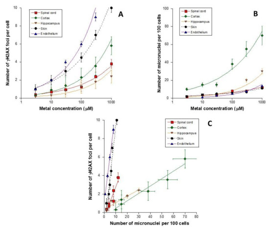 Lastly, while the production of one RI DSB requires more than 100 eV per nm3 (this energy is reached at doses higher than 25 mGy, i.e., equivalent to that delivered during a standard chest CT scan exam) [14], exposure to metals was long considered to be too energetically low to directly produce numerous DSB [56]. However, the present study pointed out that metal exposure can result in the significant production of DSB in a non-linearly concentration-dependent manner. In the present study, we did not investigate the way by which MI DNA damage is induced. A number of biochemical models have been proposed to this aim and they suggest either direct or indirect formation of DNA damage produced by the presence of metal [16,57,58]. The relevance of the RIANS model applied to MI stress does not depend on the fact that MI DSB are directly or indirectly produced. However, the MI DNA damage production likely appears to be strongly dependent on the nature of the metallic species considered, and the biochemical and molecular features of the production of MI DSB need to be investigated further.