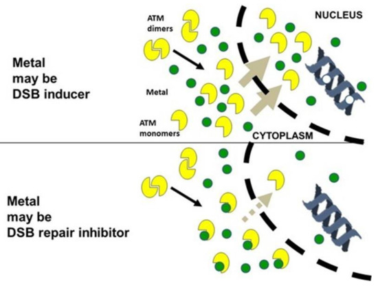 Our findings obtained with different assays and endpoints (γH2AX, pATM, MRE11, micronuclei) and with several metallic species suggest that exposure to metal leads to the production of DSB, whether direct or indirect, and the activation of the ATM protein kinase. Like after exposure to ionizing radiation, exposure to metal is consistent with a model based on the production of ATM monomers in the cytoplasm that diffuse into the nucleus at a specific rate and extent depending on the metallic species and on their concentration. At high metal concentrations, some ATM-metal complexes prevent the diffusion of ATM monomers in the nucleus, which impairs the DSB recognition and repair, leading to toxicity and/or carcinogenicity. Some specific biomarkers are proposed to better evaluate the risks associated with exposure to metal.