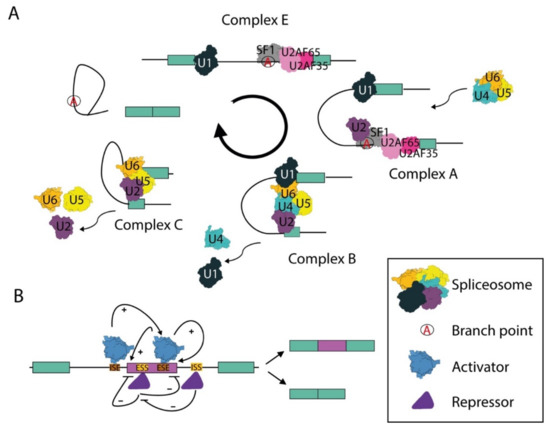 In the initial step of splicing, the U1 snRNP is recruited at the 5′ splice site, while the 3′ splice site is recognized by non-snRNP factors known as splicing factor 1 (SF1) and the complex formed by the U2 auxiliary factors of 35 (U2AF35) and 65 (U2AF65) kilodaltons. SF1 recognizes the invariant A nucleotide, named the branch point, which serves as the docking site for the first trans-esterification reaction; U2AF35 binds the invariant AG dinucleotide at the 3′-end of the intron; U2AF65 is recruited to a polypyrimidine-rich sequence localized between the branchpoint and the 3′ splice site (Figure 1A) [10,11]. Following these protein–RNA interactions, U2 is recruited to the branch point in the pre-mRNA to form the A complex, or pre-spliceosome. Complex B is then formed by the recruitment of the tri-snRNP U4/U6 and U5. After conformational rearrangements and the dissociation of the U1 and U4 snRNPs, the spliceosome enters in its activated form, named B active complex, and catalyzes the two trans-esterification reactions required for intron excision and exon joining (Figure 1A) [10,11]. Several of the proteins that are associated with the snRNPs play a key role in these processes. For instance, the pre-mRNA-processing-splicing factor 8 (Prp8) of the U5 snRNP forms a scaffold that stabilizes the RNA catalytic core and maintains an open arrangement for the intron substrate, whereas the Brr2 helicase promotes the unwinding of the U4/U6 duplex. Other proteins, like Prp24, Prp3 and Prp4, are instead required for U4/U6 and U4/U6–U5 formation [10,11]. At the end of the splicing reaction, the spliceosome is disassembled and its proteins are recycled for new splicing processes.