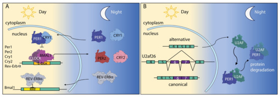 The circadian clock and RNA processing regulation. (A) Schematic representation of the circadian clock pathway. Upon circadian stimulation, the two transcription factors CLOCK and BMAL1 form a complex that binds the E-box motif in the promoter region of their target genes (such as PER1/2 CRY1/2 and Rev-Erbα) inducing their transcription. PER1 and CRY1 proteins then translocate into the nucleus to form a complex and repress CLOCK:BMAL1, thus forming a negative feedback mechanism that controls the pathway. In parallel, REV-Erbα translocates into the nucleus and contributes to repression of the transcription of BMAL1. (B) The U2AF26 transcript is alternatively spliced to yield two different isoforms, whose expression follows the circadian rhythms: the canonical isoform that includes exon 6 and 7 (purple exons) and the alternative one skipping them. The alternative isoform leads the formation of a different domain at the C-terminus, resulting in a new interaction of this splicing regulator with PER1 and promoting its degradation.