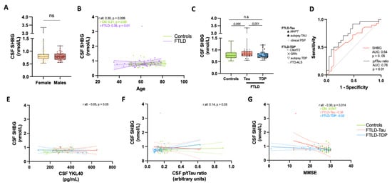 CSF SHBG levels of FTLD of patients with known underlying neuropathology. (A) Box-dot plots depict the CSF SHBG levels between males and females. (B) Spearman correlation analysis depicts an association between SHBG and age, which was mainly driven by the FTLD group (purple). Correlation coefficient and p value are presented in inserts. Regression line and 95% confident intervals for FTLD (purple) and controls (green) are included. (C) Box-dot plots depict the CSF SHBG levels between controls, FTLD-Tau and FTLD-TDP. Specific symbols depict patient subgroups within each pathological subtype. Exact p values after post-hoc analysis are included. (D) Receiver operator characteristic (ROC) curve depicting the predictive performance of CSF SHBG (red) or CSF p/tTau ratio (black) discriminating FTLD-Tau from FTLD-TDP subtypes. The exact area under the curve (AUC) and p value are presented in inserts. (E–G) Scatter plots depict the correlation between CSF SHBG with (E) CSF YKL40, (F) p/tTau ratio and (G) MMSE score. Correlation coefficient and p value are presented in inserts. Regression line and 95% confident intervals are included. The different diagnostic groups are depicted by colors. CN, controls; FTLD, Frontotemporal lobar degeneration; PSP, progressive supranuclear palsy; FTD-ALS, Frontotemporal dementia—Amyotrophic lateral sclerosis; ns, non-significant.