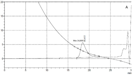 Penetration chromatography analysis of PCL intermediates revealed a different elution pattern for MKC-P, strain 7 and co-culture of strain 7 and strain 2 that was especially well demonstrated on 48 h of cultivation (Figure 4). A peak corresponding to the molecular weight of 14,000 representing the original PCL (Figure 4A, Control) added to the culture medium appeared in the elution volume of 18.45 mL in strain 7 and co-culture of strain 7 and strain 2 samples, however with a different share—83.74% for strain 7 and 54.99% for the co-culture. In the supernatant from strain 7, the only additional peak was with an elution volume of 27.06 mL that corresponded with the monomer Ɛ-caprolactone (14.99%). In the co-culture of strains 7 and 2, three other peaks with elution volumes of 24.39, 25.13, and 26.93 mL were observed, corresponding of intermediates with a molecular weight of hexamer (22.78%), trimer (3.67%), and monomer (4.25%) (Figure 4B). In the supernatant from MKC-P, PCL peak was almost not observed and the registered peaks with elution volumes 23.82 mL and 25.79 mL corresponded with 12-mer (8.2%) and dimer (91.7%). The characteristic peaks in the elution profiles of the three samples were very similar for the samples from 72, 96, 120, and 168 h of cultivation.
