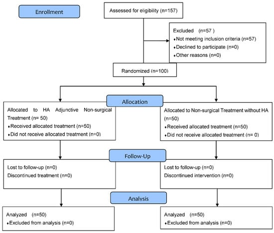 Patients enrolled in the study received code numbers. Randomizing software was used to randomly allocate patients to one of the two groups (non-surgical treatment only study group, and non-surgical treatment with adjunctive hyaluronic acid (HA) treatment control group; allocation ratio: 1:1) was used []. Participants were blinded to which treatment group they were assigned, as the hyaluronic acid was applied by an anesthetic syringe, whereas the non-surgical treatment alone also involved using an anesthetic syringe containing anesthetic agent.