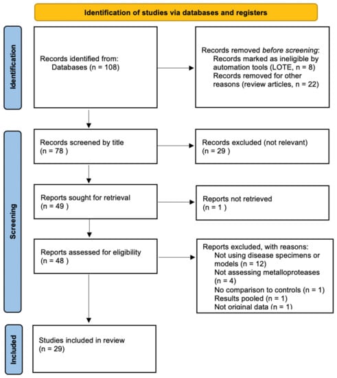 Following the implementation of the search strategy, 108 titles were identified on databases. Of these, 29 articles [,,,,,,,,,,,,,,,,,,,,,,,,,,,,] met the inclusion criteria and were included in the qualitative synthesis (Figure 1).