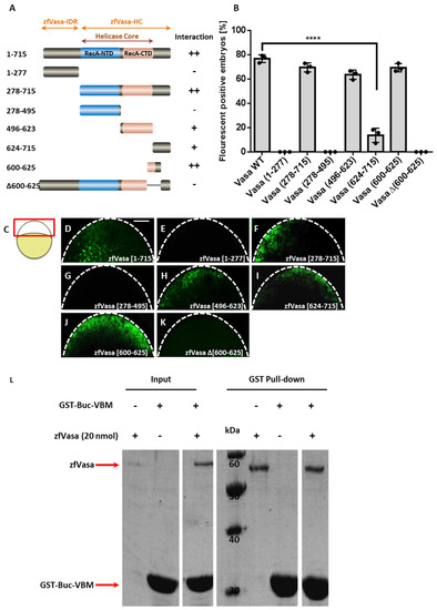 In order to further clarify this issue, we adapted the mapping strategy by removing 50 amino acids from the C-terminal region of the construct, containing both RecA-CTD and eRecA-CTD. While doing so, we detected that the number of fluorescent embryos dramatically dropped from 71% to 24% when we deleted 50 amino acids, trimming 665–615 (Supplementary Figure S2). This observation is similar to the results described above, where we observed a reduction of fluorescent embryos after splitting through RecA-CTD and eRecA-CTD (Figure 2B,H,I). Taken altogether, with this approach, we narrowed down zfVasa-BBM to residues 600–665. We then continued mapping by removing a further ten amino acids from the C-terminus of the previously identified construct (amino acids 600–665) (Supplementary Figure S2). Using this approach, we were able to identify amino acids 600–625 as the minimal sequence for zfVasa-BBM (Figure 2A,B,J). As a control, we deleted amino acids 600–625 from full-length zfVasa and checked for an interaction with Buc. We observed no fluorescent embryos, suggesting that residues 600–625 are indeed sufficient and necessary for zfVasa interactions (Figure 2A,B,K).