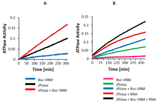 Our data show that Buc directly binds to zfVasa. This raises the question of what the functional consequences of this interaction are. It has been previously demonstrated that protein cofactors modulate the enzymatic ATPase activity of DEAD box proteins. A recent study discovered that the Osk LOTUS domain stimulates the ATPase activity of DmVasa upon their interaction, albeit Osk does not belong to a canonical protein family of the ATPase regulating cofactors [24]. We next aimed to check whether Buc-VBM could modulate the ATPase activity of zfVasa upon binding. To quantify the zfVasa activity in vitro, we employed a spectrophotometric enzymatic assay monitoring nicotinamide adenine dinucleotide (NADH) conversion [33].