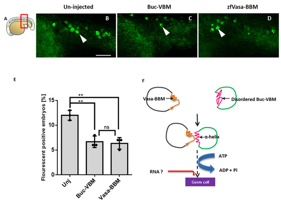 Recent studies demonstrated that the LOTUS domain of Osk physically binds to the C-terminal RecA-like domain (RecA-CTD) of Drosophila Vasa (DmVasa), which stimulates its ATPase activity [24,25]. We also showed that Buc interacts with zebrafish Vasa (zfVasa) in vivo during germ cell specification [23]. Besides, we observed that the overexpression of zfVasa induced ectopic germ cells, identifying zfVasa as the second protein with a germ cell specification activity in zebrafish [23]. However, thus far, a zfVasa-binding motif in Buc (Buc-VBM) or Buc-binding motif in zfVasa (Vasa-BBM) has not been identified. Moreover, no specific biochemical function could be ascribed for Buc apart from being recognized as a scaffolding protein that brings proteins together, such as Hermes, Tdrd6a, or Igf2bp3 [26,27,28]. The biochemical function of Buc-specifying PGCs remains to be defined.