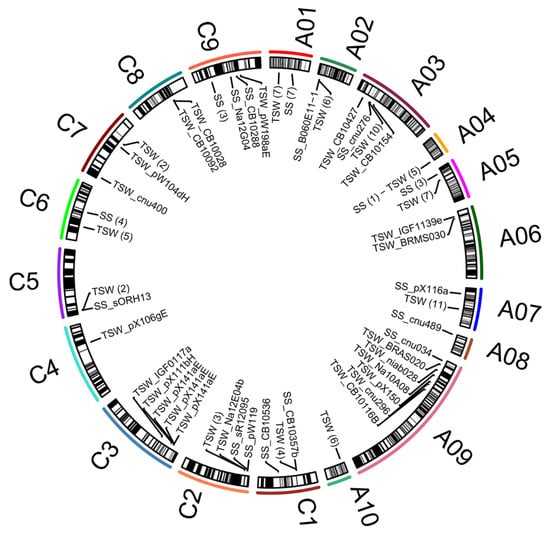 Distribution of QTLs for seeds per silique (SS) and seed weight (TSW) across the chromosomes (A01–A10; C1–C9) of rapeseed. Values between parentheses indicate the number of QTLs for a given trait (for details see Supplementary Table S1).