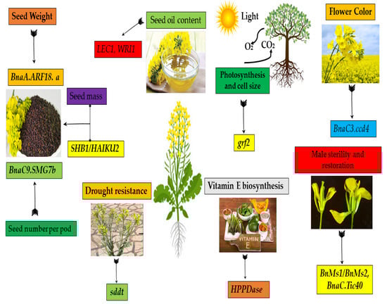 In rapeseed, only two findings were reported that demonstrated the gene cloning for TSW and SS, respectively. For SS, qSS.C9, the QTL is thought to be one of the important QTLs [] that play a significant role in developing female gametophytes []. Additionally, the ARF18 gene controls both TSW and SL QTL formation []. Moreover, the ARF18 gene slowed down the function of the auxin gene and had an inhibitory effect on its biological activity, which was assumed to modulate the activity of silique wall development and TSW by regulating maternal genes []. Furthermore, many other genes also play a tremendous role in cloning many other important traits, viz. yield, abiotic stress, seed oil, disease resistance, etc., as presented in Figure 2.