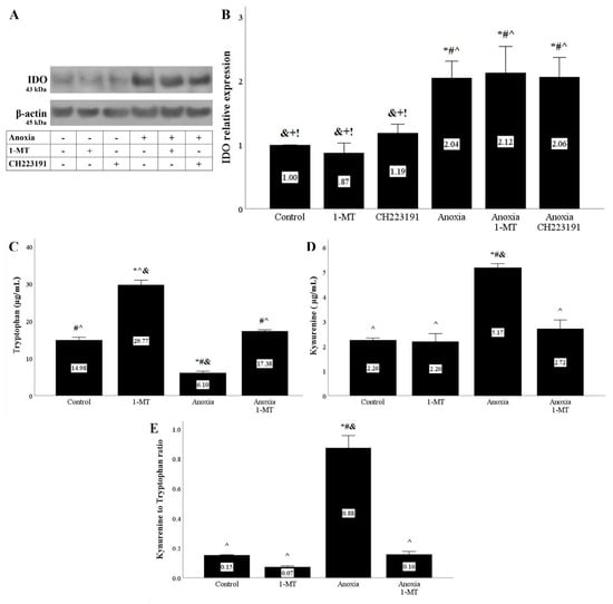 Anoxia upregulates IDO expression and activity. Cells were cultured under anoxic conditions for 24 h along with the indicating treatments. Anoxia in the presence or not of 1MT or CH223191 increased IDO protein level. A representative Western blot experiment is displayed in panel (A), whereas panel (B) depicts the cumulative results of four repeated experiments. * p < 0.05 vs. Control, # p < 0.05 vs. Control with 1-MT, ^ p < 0.05 vs. Control with CH223191, & p < 0.05 vs. Anoxia, + p < 0.05 vs. Anoxia with 1-MT, ! p < 0.05 vs. Anoxia with CH223191. IDO activity assessed by the ratio of kynurenine to tryptophan concentration in cell culture supernatants also increased under anoxic conditions, an effect that is abolished by the IDO inhibitor 1-MT (C–E). Six such experiments were performed. * p < 0.05 vs. Control, # p < 0.05 vs. Control with 1-MT, ^ p < 0.05 vs. Anoxia, & p < 0.05 vs. Anoxia with 1-MT. Error bars correspond to SEM. 1-MT, 1-DL-methyltryptophan; IDO, indoleamine 2,3-dioxygenase 1.