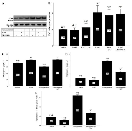 Reoxygenation upregulates IDO expression and activity. Cells were cultured under anoxic conditions for 24 h and then subjected to 2 h of reoxygenation along with the indicating treatments. Reoxygenation in the presence or not of 1-MT or CH223191 increased IDO protein level. A representative Western blot experiment is displayed in panel (A), whereas panel (B) depicts the cumulative results of four repeated experiments. * p < 0.05 vs. Control, # p < 0.05 vs. Control with 1-MT, ^ p < 0.05 vs. Control with CH223191, & p < 0.05 vs. Reoxygenation, + p < 0.05 vs. Reoxygenation with 1-MT, ! p < 0.05 vs. Reoxygenation with CH223191. IDO activity assessed by the ratio of kynurenine to tryptophan concentration in cell culture supernatants also increased under reoxygenation, an effect that is abolished by the IDO inhibitor 1-MT (C–E). Six such experiments were performed. * p < 0.05 vs. Control, # p < 0.05 vs. Control with 1-MT, ^ p < 0.05 vs. Reoxygenation, & p < 0.05 vs. Reoxygenation with 1-MT. Error bars correspond to SEM. 1-MT, 1-DL-methyltryptophan; IDO, indoleamine 2,3-dioxygenase 1; Reox, reoxygenation.