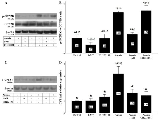 Anoxia activates both IDO activity-derived pathways. Cells were cultured under anoxic conditions for 24 h along with the indicating treatments. Anoxia activated the GCN2K pathway assessed by the level of phosphorylated activated GCN2K. 1-MT, but not CH223191, prevented GCN2K activation. A representative Western blot experiment is displayed in panel (A), whereas panel (B) depicts the cumulative results of four repeated experiments. Anoxia activated the AhR pathway assessed by the level of the AhR transcriptional target CYP1A1. Both the IDO inhibitor 1-MT and the AhR inhibitor CH223191 prevented AhR activation. A representative Western blot experiment is displayed in panel (C), whereas panel (D) depicts the cumulative results of four repeated experiments. * p < 0.05 vs. Control, # p < 0.05 vs. Control with 1-MT, ^ p < 0.05 vs. Control with CH223191, & p < 0.05 vs. Anoxia, + p < 0.05 vs. Anoxia with 1-MT, ! p < 0.05 vs. Anoxia with CH223191. Error bars correspond to SEM. 1-MT, 1-DL-methyltryptophan; CYP1A1, cytochrome P450, family 1, subfamily A, polypeptide 1; GCN2K, general control nonderepressible 2 kinase; p-GCN2K, phosphorylated GCN2K.
