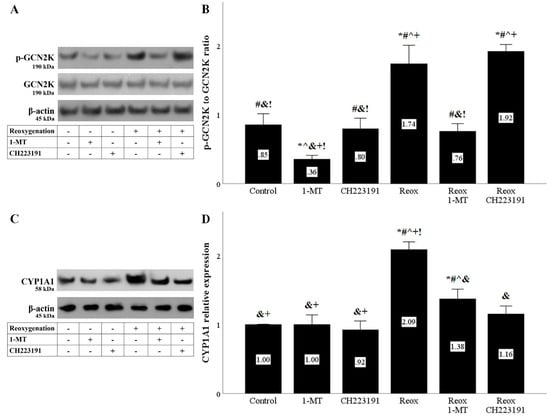 Reoxygenation activates both IDO activity-derived pathways. Cells were cultured under anoxic conditions for 24 h and then subjected to 2 h of reoxygenation along with the indicating treatments. Reoxygenation activated the GCN2K pathway assessed by the level of phosphorylated activated GCN2K. 1-MT, but not CH223191, prevented GCN2K activation. A representative Western blot experiment is displayed in panel (A), whereas panel (B) depicts the cumulative results of four repeated experiments. Reoxygenation activated the AhR pathway assessed by the level of the AhR transcriptional target CYP1A1. Both the IDO inhibitor 1-MT and the AhR inhibitor CH223191 prevented AhR activation. A representative Western blot experiment is displayed in panel (C), whereas panel (D) depicts the cumulative results of four repeated experiments. * p < 0.05 vs. Control, # p < 0.05 vs. Control with 1-MT, ^ p < 0.05 vs. Control with CH223191, & p < 0.05 vs. Reox, + p < 0.05 vs. Reox with 1-MT, ! p < 0.05 vs. Reox with CH223191. Error bars correspond to SEM. 1-MT, 1-DL-methyltryptophan; CYP1A1, cytochrome P450, family 1, subfamily A, polypeptide 1; GCN2K, general control nonderepressible 2 kinase; p-GCN2K, phosphorylated GCN2K; Reox, reoxygenation.