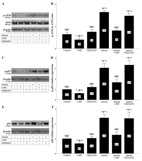 Anoxia induces DNA damage response that is ameliorated by inhibition of IDO. Cells were cultured under anoxic conditions for 24 h along with the indicating treatments. Anoxia induced a DNA damage response assessed by the level of phosphorylated activated ATM. 1-MT, but not CH223191, prevented p-ATM upregulation. A representative Western blot experiment is displayed in panel (A), whereas panel (B) depicts the cumulative results of four repeated experiments. Anoxia increased p-p53 level. 1-MT, but not CH223191, prevented p-p53 increase. A representative Western blot experiment is displayed in panel (C), whereas panel (D) depicts the cumulative results of four repeated experiments. Anoxia increased p53 level. 1-MT, but not CH223191, prevented p53 rise. A representative Western blot experiment is displayed in panel (E), whereas panel (F) depicts the cumulative results of four repeated experiments. * p < 0.05 vs. Control, # p < 0.05 vs. Control with 1-MT, ^ p < 0.05 vs. Control with CH223191, & p < 0.05 vs. Anoxia, + p < 0.05 vs. Anoxia with 1-MT, ! p < 0.05 vs. Anoxia with CH223191. Error bars correspond to SEM. 1-MT, 1-DL-methyltryptophan; p-p53, phosphorylated p53.
