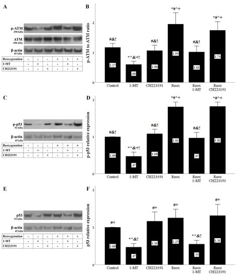 Reoxygenation induces DNA damage response that is ameliorated by inhibition of IDO. Cells were cultured under anoxic conditions for 24 h and then subjected to 2 h of reoxygenation along with the indicating treatments. Reoxygenation induced a DNA damage response assessed by the level of phosphorylated activated ATM. 1-MT, but not CH223191, prevented p-ATM upregulation. A representative Western blot experiment is displayed in panel (A), whereas panel (B) depicts the cumulative results of four repeated experiments. Reoxygenation increased p-p53 level. 1-MT, but not CH223191, prevented p-p53 increase. A representative Western blot experiment is displayed in panel (C), whereas panel (D) depicts the cumulative results of four repeated experiments. Although 1-MT decreased p53 levels, reoxygenation per se did not affect p53. CH223191 left p53 levels unaffected. A representative Western blot experiment is displayed in panel (E), whereas panel (F) depicts the cumulative results of four repeated experiments. * p < 0.05 vs. Control, # p < 0.05 vs. Control with 1-MT, ^ p < 0.05 vs. Control with CH223191, & p < 0.05 vs. Reox, + p < 0.05 vs. Reox with 1-MT, ! p < 0.05 vs. Reox with CH223191. Error bars correspond to SEM. 1-MT, 1-DL-methyltryptophan; p-p53, phosphorylated p53, Reox, reoxygenation.