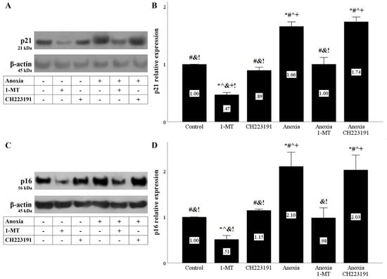 Anoxia upregulates the cell-cycle inhibitors p21 and p16, whereas inhibition of IDO prevents their upregulation. Cells were cultured under anoxic conditions for 24 h along with the indicating treatments. Anoxia upregulated p21. 1-MT, but not CH223191, prevented p21 upregulation. A representative Western blot experiment is displayed in panel (A), whereas panel (B) depicts the cumulative results of four repeated experiments. Anoxia increased p16 levels. 1-MT, but not CH223191, prevented p16 increase. A representative Western blot experiment is displayed in panel (C), whereas panel (D) depicts the cumulative results of four repeated experiments. * p < 0.05 vs. Control, # p < 0.05 vs. Control with 1-MT, ^ p < 0.05 vs. Control with CH223191, & p < 0.05 vs. Anoxia, + p < 0.05 vs. Anoxia with 1-MT, ! p < 0.05 vs. Anoxia with CH223191. Error bars correspond to SEM. 1-MT, 1-DL-methyltryptophan.