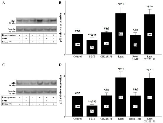 Reoxygenation upregulates the cell-cycle inhibitors p21 and p16, whereas inhibition of IDO prevents their upregulation. Cells were cultured under anoxic conditions for 24 h and then subjected to 2 h of reoxygenation along with the indicating treatments. Reoxygenation increased p21 levels. 1-MT, but not CH223191, prevented p21 increase. A representative Western blot experiment is displayed in panel (A), whereas panel (B) depicts the cumulative results of four repeated experiments. Reoxygenation upregulated p16 levels. 1-MT, but not CH223191, prevented p16 upregulation. A representative Western blot experiment is displayed in panel (C), whereas panel (D) depicts the cumulative results of four repeated experiments. * p < 0.05 vs. Control, # p < 0.05 vs. Control with 1-MT, ^ p < 0.05 vs. Control with CH223191, & p < 0.05 vs. Reox, + p < 0.05 vs. Reox with 1-MT, ! p < 0.05 vs. Reox with CH223191. Error bars correspond to SEM. 1-MT, 1-DL-methyltryptophan; Reox, reoxygenation.