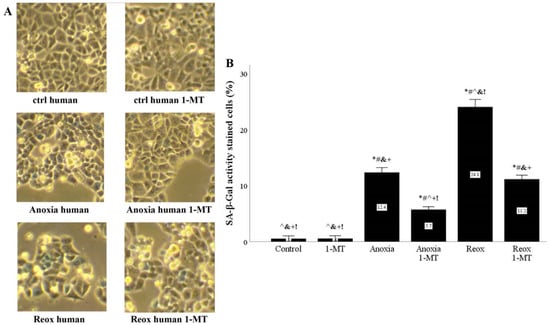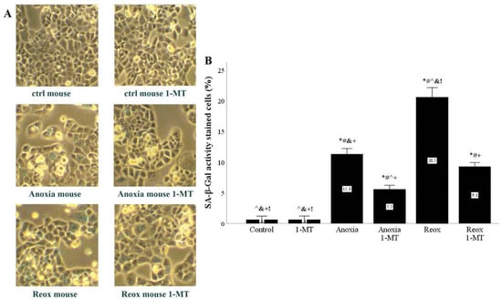 In mouse RPTECS, IDO inhibition decreased anoxia- or reoxygenation-induced upregulation of SA-β-Gal activity. Mouse RPTECs were cultured under anoxic conditions for 24 h or subsequently subjected to reoxygenation for another 2 h. A representative of three independent experiments is depicted in panel (A). Anoxia upregulated SA-β-Gal activity, which was further upregulated by reoxygenation. In both cases, the IDO inhibitor 1-MT decreased SA-β-Gal activity (B). * p < 0.05 vs. Control, # p < 0.05 vs. Control with 1-MT, ^ p < 0.05 vs. Anoxia, & p < 0.05 vs. Anoxia with 1-MT, + p < 0.05 vs. Reox, ! p < 0.05 vs. Reox with 1-MT. Error bars correspond to SEM. 1-MT, 1-DL-methyltryptophan; Reox, reoxygenation; SA-β-Gal, senescence-associated β-galactosidase.