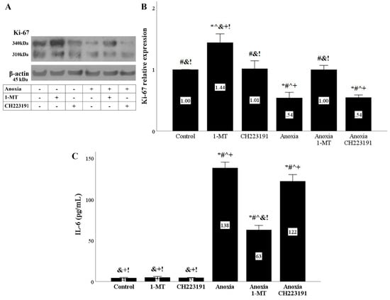 Anoxia inhibits cell proliferation and induces IL-6 production in an IDO dependent manner. Cells were cultured under anoxic conditions for 24 h along with the indicating treatments. Anoxia decreased the levels of the cell proliferation marker Ki-67. The IDO inhibitor 1-MT restored Ki-67 levels, whereas the AhR inhibitor CH223191 left Ki-67 levels unaffected. A representative Western blot experiment is displayed in panel (A), whereas panel (B) depicts the cumulative results of four repeated experiments. Anoxia increased IL-6 concentration in the RPTECs culture supernatants. 1-MT decreased the anoxia-induced IL-6 production, whereas CH223191 did not affect IL-6 levels (C). Six such experiments were performed. * p < 0.05 vs. Control, # p < 0.05 vs. Control with 1-MT, ^ p < 0.05 vs. Control with CH223191, & p < 0.05 vs. Anoxia, + p < 0.05 vs. Anoxia with 1-MT, ! p < 0.05 vs. Anoxia with CH223191. Error bars correspond to SEM. 1-MT, 1-DL-methyltryptophan; IL-6, interleukin-6.