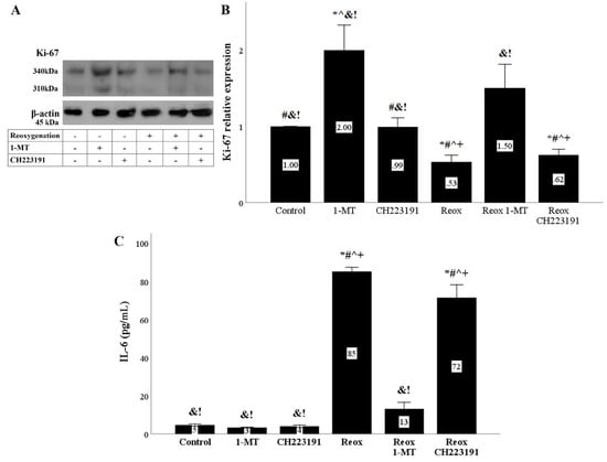 Reoxygenation inhibits cell proliferation and induces IL-6 production in an IDO dependent manner. Cells were cultured under anoxic conditions for 24 h and then subjected to 2 h of reoxygenation along with the indicating treatments. Reoxygenation reduced the levels of the cell proliferation marker Ki-67. The IDO inhibitor 1-MT restored Ki-67 levels, whereas the AhR inhibitor CH223191 did not affect Ki-67. A representative Western blot experiment is displayed in panel (A), whereas panel (B) depicts the cumulative results of four repeated experiments. Reoxygenation increased IL-6 concentration in the RPTECs culture supernatants. 1-MT reduced the reoxygenation-induced IL-6 production, whereas CH223191 did not affect IL-6 levels (C). Six such experiments were performed. * p < 0.05 vs. Control, # p < 0.05 vs. Control with 1-MT, ^ p < 0.05 vs. Control with CH223191, & p < 0.05 vs. Reox, + p < 0.05 vs. Reox with 1-MT, ! p < 0.05 vs. Reox with CH223191. Error bars correspond to SEM. 1-MT, 1-DL-methyltryptophan; IL-6, interleukin-6; Reox, reoxygenation.