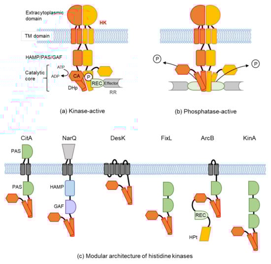 TCSs are generally composed of a sensor histidine kinase (HK) and its partner response regulator (RR). HKs are mostly homodimeric and are located either at the membrane or inside the cell. Approximately 83% of HKs contain transmembrane regions [9]. A prototypical HK (Figure 1a) is composed of an extracytoplasmic or periplasmic sensor domain, transmembrane (TM) domain, usually one or more intracellular signal domains (HAMP, a domain found in histidine kinases, adenylyl cyclases, methyl binding proteins, and phosphatases; PAS, Per-ARNT-Sim; or GAF, a domain found in cGMP-specific phosphodiesterase, adenylyl cyclases, and FhlA), and a catalytic core (or kinase domain) that consists of a DHp (dimerization and histidine phosphorylation) domain and a CA (catalytic/ATP binding) domain. Upon signal perception in the sensor domain, the signal is transduced across the membrane via the TM domain, transmitted through the intracellular signal domains, and eventually to the catalytic core. At the catalytic core, ATP binds to the CA domain and autophosphorylates the conserved His residue in the DHp domain. This is followed by the transfer of the phosphate moiety to the conserved Asp residue in the receiver (REC) domain of the partner RR. The phosphorylated RR triggers downstream responses most frequently by binding to DNA for transcriptional control of its target gene. In some cases, RRs bind to RNA or proteins, or they exert enzymatic activity [10].