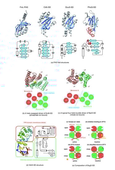 Structure comparison of extracellular sensor domains. (a) Comparison of PAS fold structures. FixL (1DP6) has a PAS fold as an intracellular signal-sensing domain. CitA (2J80), DcuS (3BY8), and PhoQ (3BQ8) have a PAS fold as an extracellular signal-sensing domain. The β-strand indicated in blue is a conserved core structure in the PAS fold, and signal molecules are bound to this region in FixL (ferric heme), CitA (citrate), and DcuS (L-malate), whereas in PhoQ, two α-helices (red) containing acidic clusters are present in addition to the PAS-fold. A nickel ion (green sphere) is bound to the additional helix. (b,c) Comparison of the dimer interface of the all α-helix type-sensing domains [50]. The upper panels show top-down view of KinB (3KKB) and NarX (3EZH), while the lower panels show schematic representation of the α-helix arrangement. The ligand molecules, which are phosphate ion for KinB and nitrate ion for NarX, are shown in yellow. The dimer interface of KinB is formed by six helices, while that of NarX is formed by two helices (blue dashed line). (d) Representative secondary and ribbon diagrams of VbrK-SD(7CUS). The TPR-like region is located at the distal side of the membrane and the PAS-like region is located at the proximal side of the membrane in VbrK-SD. (e) Configurations of the VFT (Venus flytrap) structure of the BvgS homodimer and its kinase activity. (i) Kinase-active state with no ligand binding to the VFTs. (ii) Kinase-inactive state with the inhibitor, nicotinate or MgSO4 (yellow sphere), binding to the VFT2. Whether VFT2 is in a closed or open state under this condition is not clarified. (iii) Kinase-active state in which the inhibitor cannot bind to the VFT2 mutant with a mutation at its ligand binding site. (iv) Kinase-inactive state in which the VFT1 is artificially closed with disulfide bonds by Cys mutations.