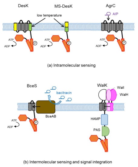 Signal perception in the TM domain. Modulating signals can be sensed either directly (a) or indirectly via other proteins (b). (a) DesK and MS-DesK (minimal sensor-DesK, which has only a single chimera TM helix of the N-terminal half of TM1 and the C-terminal half of TM5) sense low temperature by detecting the changes in membrane thickness, fluidity, and water permeability [86]. AgrC is modulated by the direct binding of a quorum-sensing factor, AIP (autoinducing peptide) [87]. (b) BceS forms a sensory complex with an ABC transporter, BceAB. The flux of peptide antibiotics such as bacitracin activates BceS [88]. Although WalK has both extracellular and intracellular signal domains, WalK activity is also modulated by two membrane proteins, WalH and WalI, through interaction at the TM domain. Whereas WalH and WalI repress WalK activity in Bacillus subtilis [89], these two proteins activate WalK in S. aureus [90,91]. HKs normally exist as dimers but are shown as monomers for simplification.