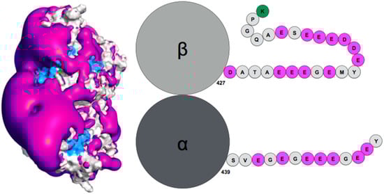 (Left) Negative surface electrostatic potential (-1 kT, magenta) of the αI/βIII isotype tubulin body without tails. The anchor residues involved in interactions with the disordered tail during molecular dynamics simulations are shown in blue; the representation is based on data published in (Laurin et al., Biochemistry 2017, 56, 1746); (right) schematic sequence of the αI/βIII isotype of tubulin, the acidic amino acids are highlighted in magenta and the basic terminal residue in green.