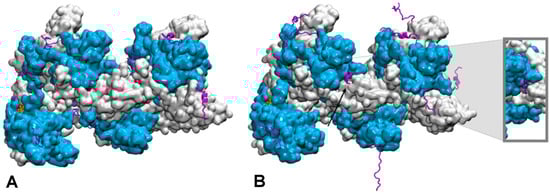 Conformational dynamics of the C-terminal tails of a two-turn, twelve monomer RecA-ssDNA filament with modified central interface, after 100 ns of molecular dynamics simulation. Successive RecA proteins are alternatively colored cyan and white. The tails (magenta, cartoon representation) explore different regions of the conformational space in terms of folding—partial α-helical folds or extended conformation—and binding to the protein core surface. (A) Simulation with no added salt; the tails mostly bind the core protein surface; (B) simulation with 5 mM Mg2+; some tails remain far from the surface, the tail from the central monomer (black arrow) penetrates inside the filament and reaches the filament site II, within 8 Å of the basic residue cluster of the neighboring monomer. The insert shows a view of the penetrating tail after 30° rotation around the filament axis. Simulations conditions are described in (Kim et al., Nucleic Acids Res. 2018, 46, 2548).